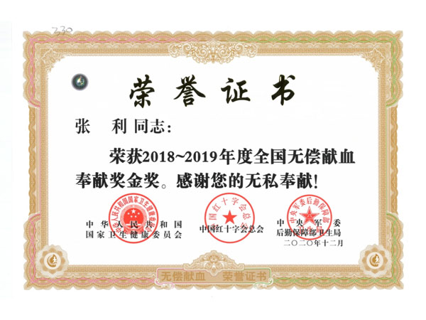 日前,我公司員工張利收到中華人民共和國國家衛生健康委員會(huì )、中國紅十字會(huì )總會(huì )、中央軍委后勤保障部衛生局三部門(mén)聯(lián)合頒發(fā)的“2018—2019年度全國無(wú)償獻血奉獻獎金獎”榮譽(yù)證書(shū),這是我國給予無(wú)償獻血者的最高獎勵。